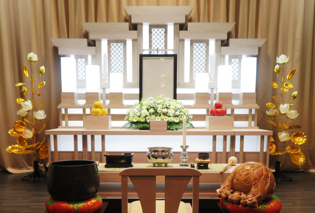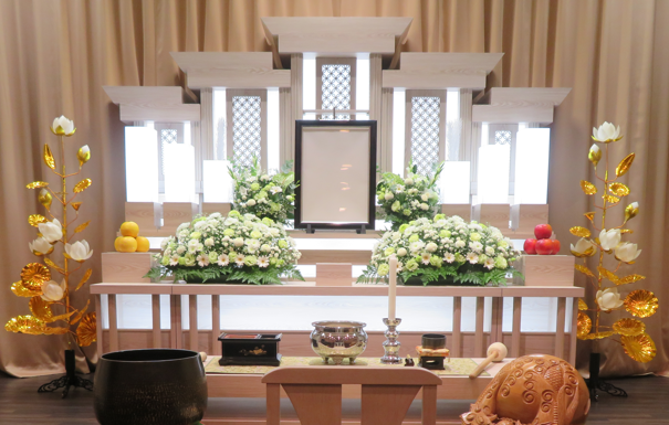 1日葬コース(仏式) 275,000円(税込) 近年増えている告別式のみを1日で行うご葬儀のコースです ※オプションとして、写真前の生花を付けることもできます |